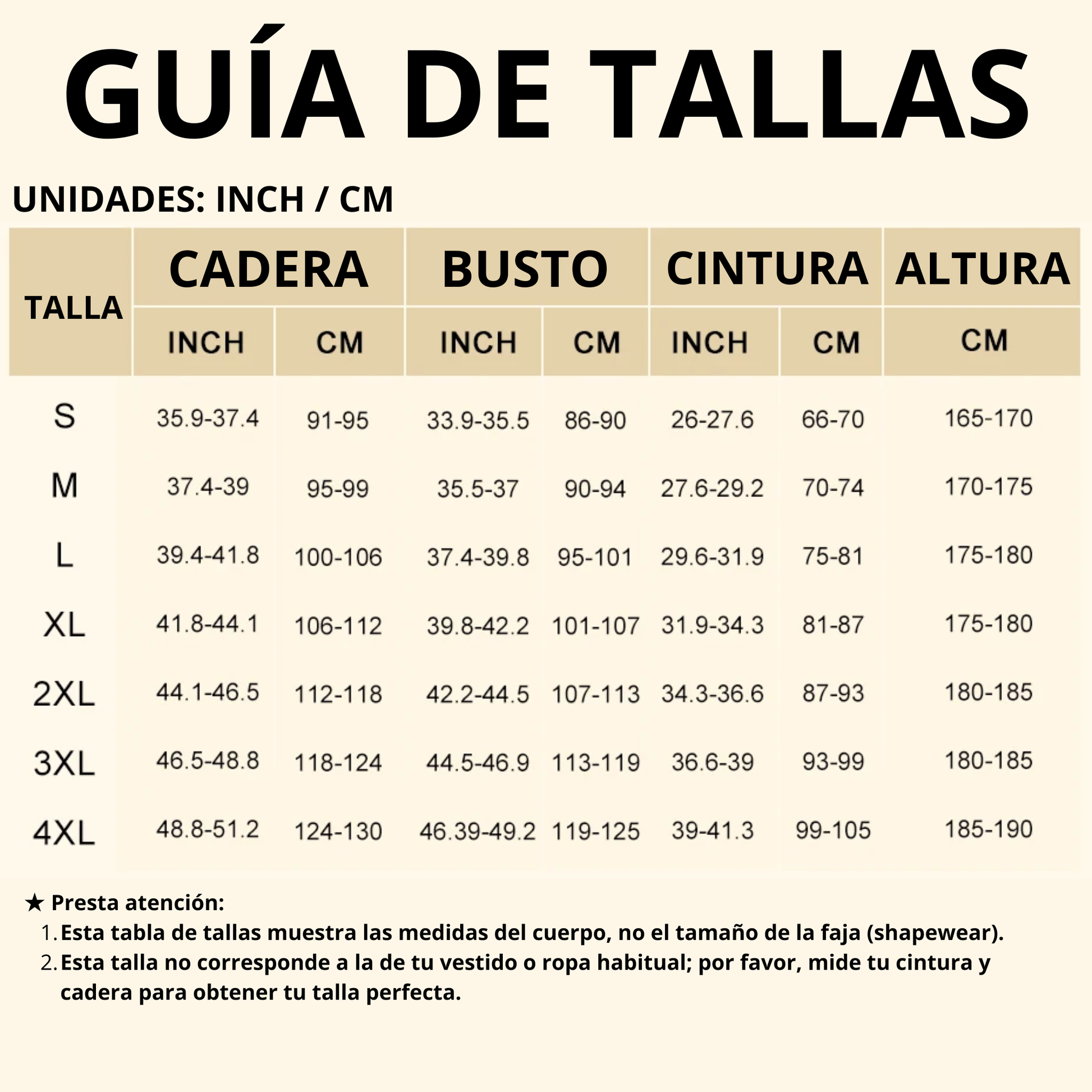 Para garantizar los mejores resultados, utiliza nuestra guía de tallas desde la S hasta la 4XL basada en medidas reales de cintura, cadera y busto. No elijas tu talla según tu ropa habitual. Mide tu cuerpo con precisión para asegurar el efecto reductor, el soporte adecuado y la máxima comodidad durante todo el día.